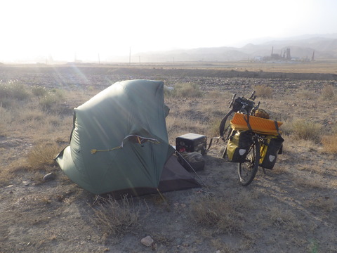 中国2 15日目 農地脇〜ウルムチから東に164km地点 農地脇2 深夜3時に強風が吹き始めて目を覚ます。運の悪いことにテントを張ってる場所は···